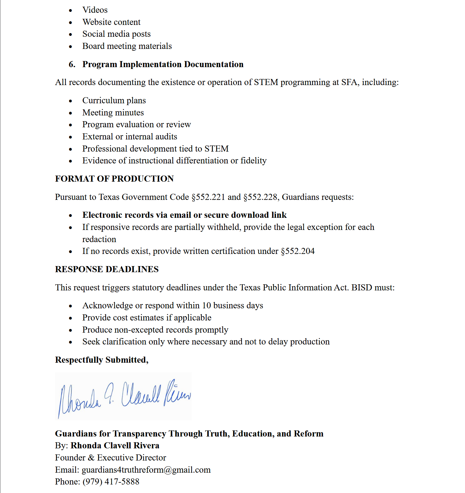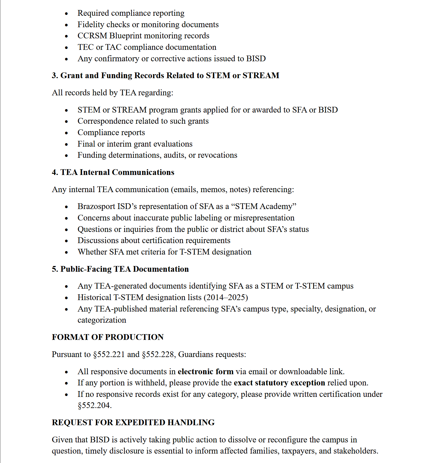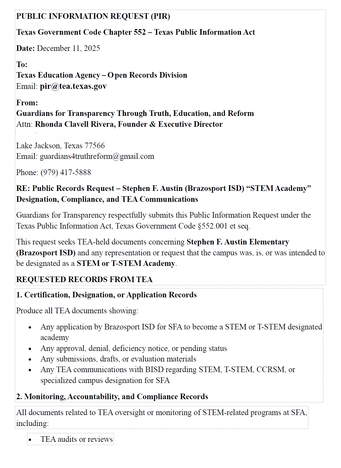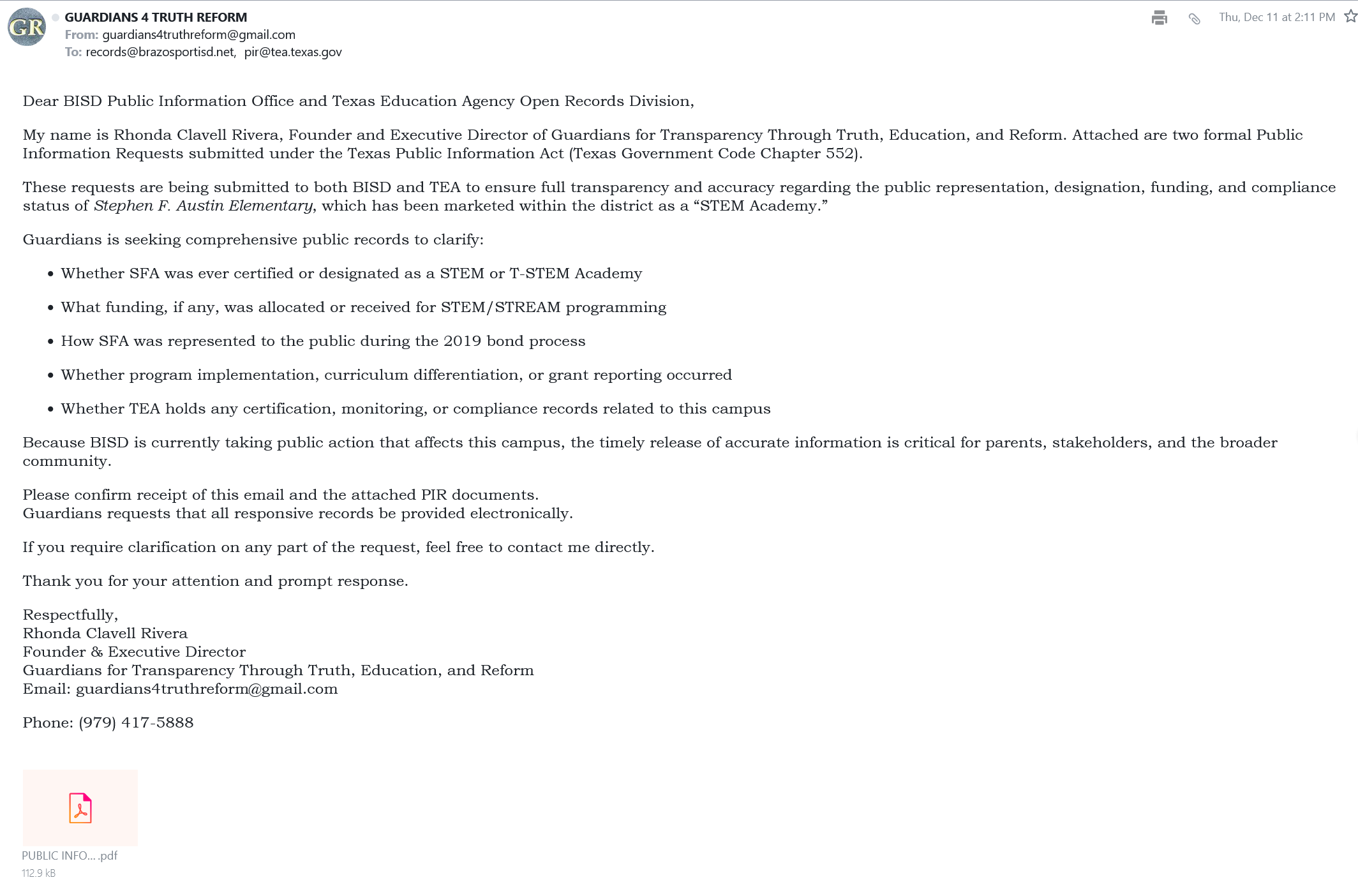 On December 11, 2025, I submitted formal Public Information Requests (#1) under the Texas Public Information Act seeking records related to bond representations, STEM designation or certification, public messaging, and related compliance documentation. These requests were submitted to ensure accuracy, transparency, and accountability for families, taxpayers, and the broader community.