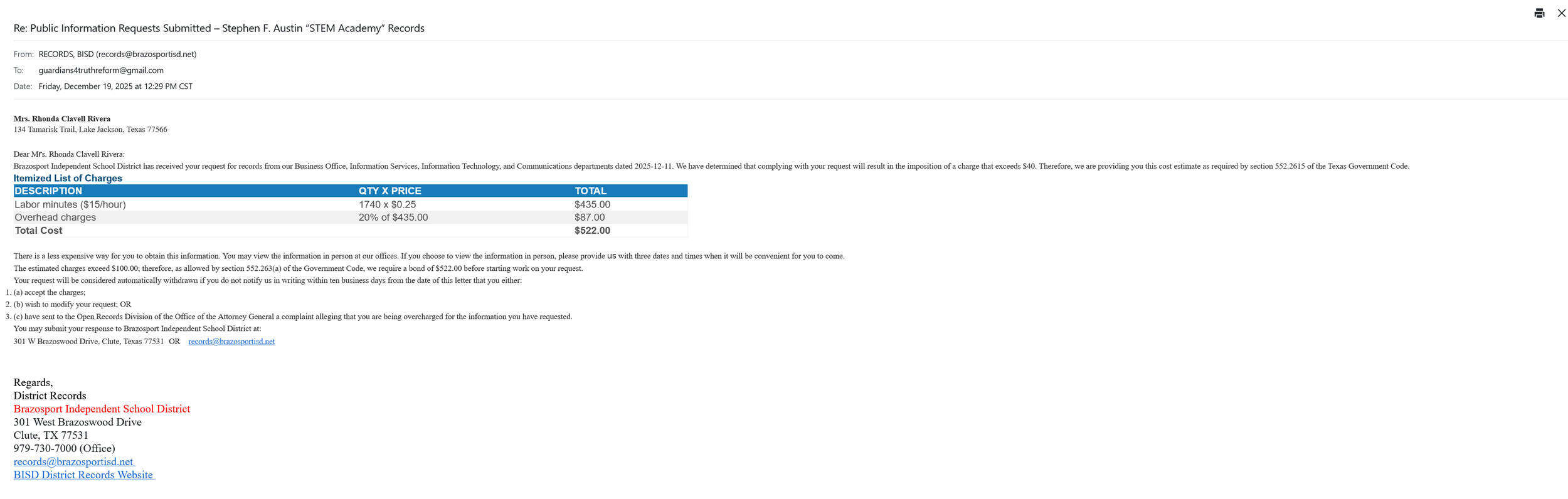 On December 19, Brazosport ISD responded with a cost estimate exceeding $500 to access these records, citing staff labor and overhead. The District did not deny that the records exist, nor did it claim any legal exemption. Instead, access to public information was conditioned on advance payment or in-person review.