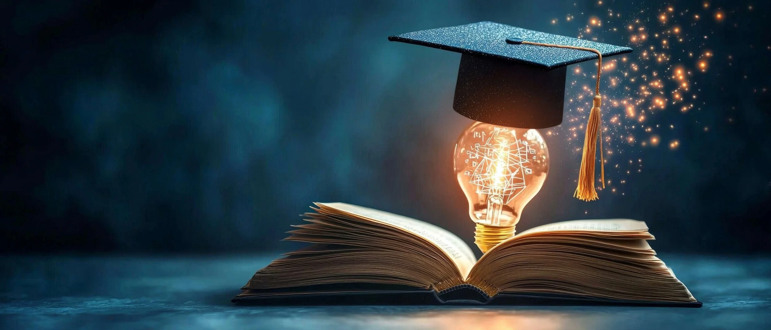 Open book with a glowing light bulb floating above it, wearing a blue graduation cap, with digital mathematical and scientific formulas around it.